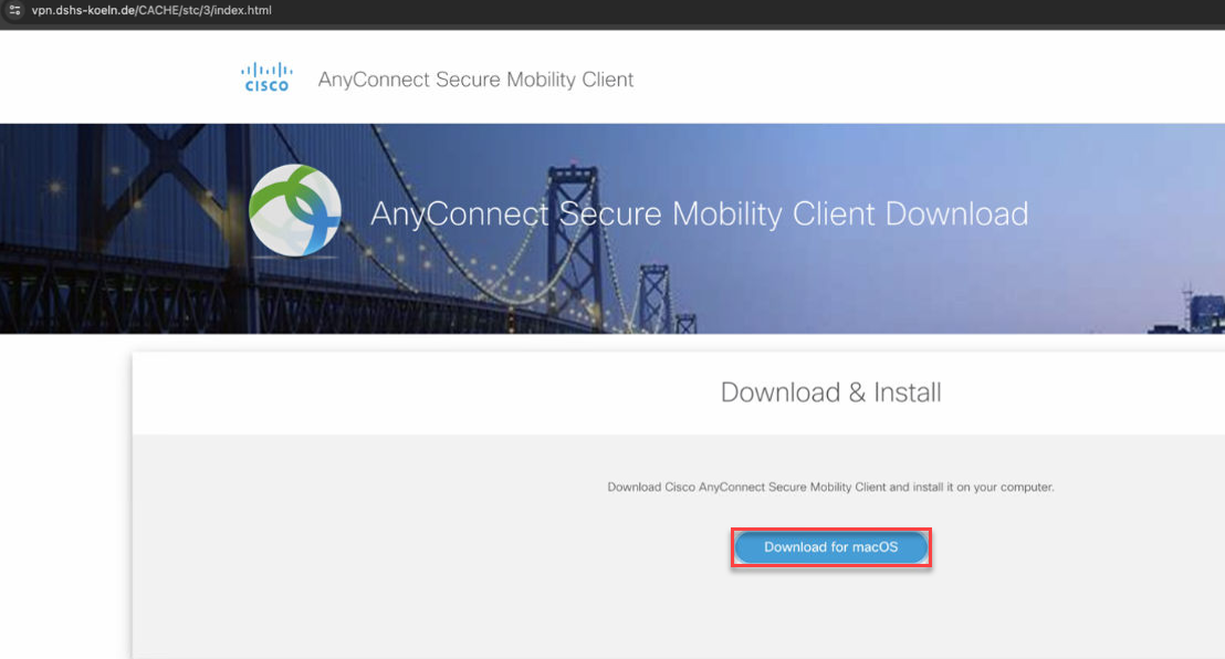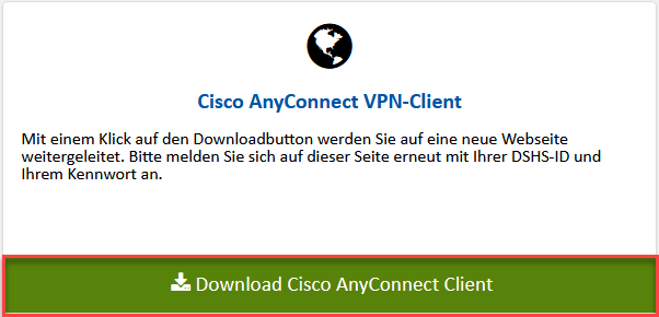 3. Nach der Anmeldung werden Sie auf die Webseite weitergeleitet und können dort auf den grünen Button "Download Cisco AnyConnect Client" klicken..