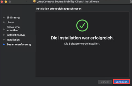 10. Die Installation von Cisco Anyconnect ist nun beendet, klicken Sie hier auf "Schließen".