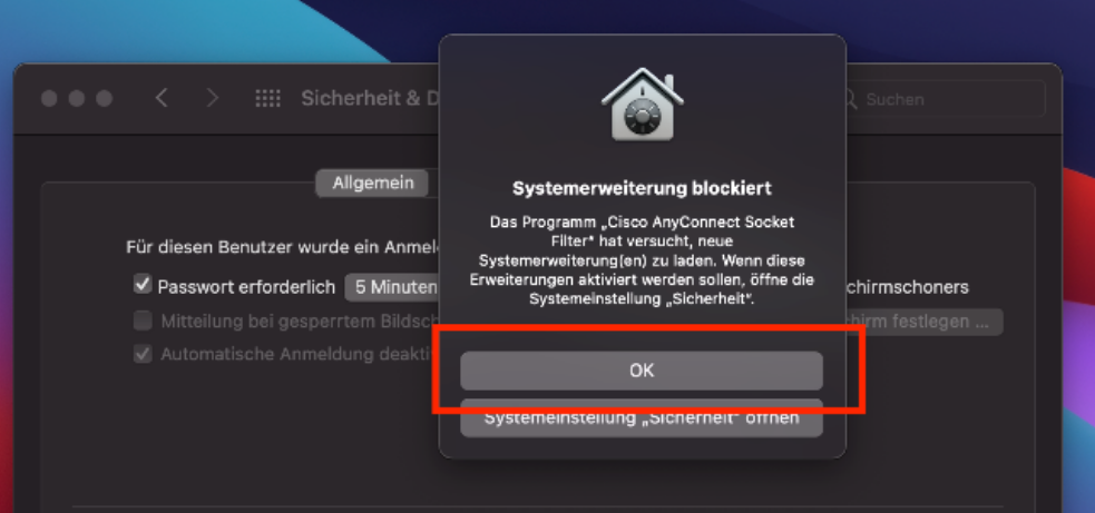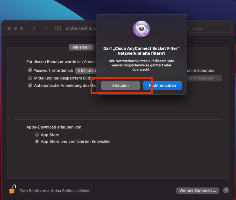 11. Im nächsten Schritt muss der "SocketFilter" in den Systemeinstellungen aktiviert und zugelassen werden. Sie erhalten einige Meldungen auf dem Bildschirm, wichtig ist das folgende Fenster, klicken Sie hier auf "Erlauben".