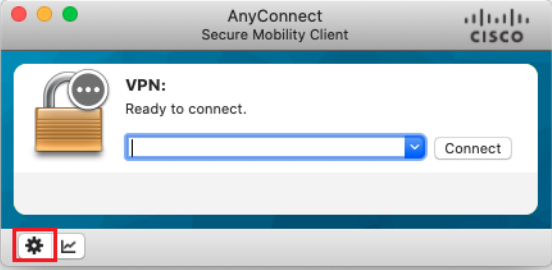 13. Starten Sie nun den Cisco AnyConnect VPN-Client. VPN-Client und klicken Sie als Erstes auf das kleine Zahnrad unten links.