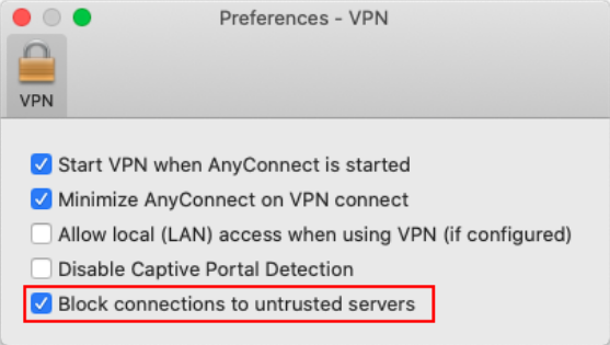 14. Bei der letzten Auswahlmöglichkeit „Block connections to untrusted servers” ist standardmäßig ein Haken gesetzt. Entfernen Sie diesen.