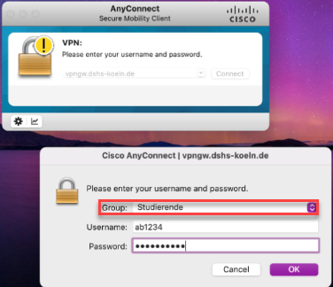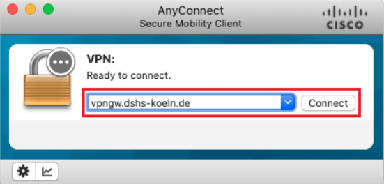 15. Tippen Sie als nächstes die Adresse vpngw.dshs-koeln.de ein und klicken Sie auf „Connect“.