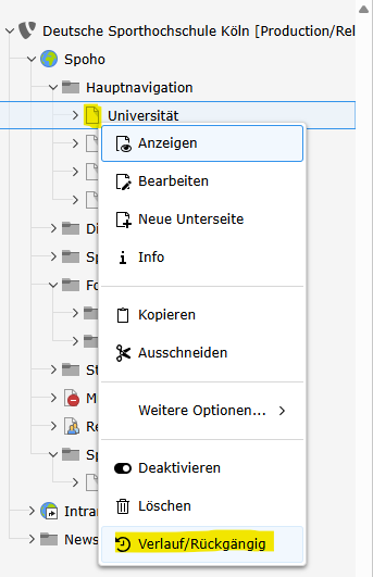 Die gesuchte Funktion öffnen Sie über einen Klick auf das Seiten-Icon im Seitenbaum, und zwar von der Seite, auf der die Änderung zurückgenommen werden soll. Klicken Sie in dem Popup-Menü auf den Punkt "Verlauf/Rückgängig".