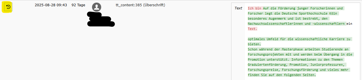 Analog zu Änderungen innerhalb von Elementen können Sie auch die Löschung von ganzen Inhaltselementen rückgängig machen. Gehen Sie dazu analog zu der obigen Beschreibung vor und stellen die entsprechende Löschung wieder her, indem Sie auf die Funktion "Feld wiederherstellen" klicken.
