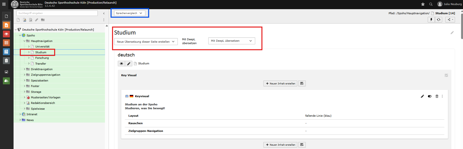 Um die Seite zu übersetzen, navigieren Sie zunächst in der Seitenansicht im Arbeitsbereich oberhalb des Seitentitels zum Drop down Menü und wählen den Sprachenvergleich aus (blauer Kasten). Dann können Sie entweder eine manuelle Übersetzung (Drop down Menü "Neue Übersetzung dieser Seite erstellen" > english) anstoßen oder eine Übersetzung mit Hilfe von DeepL (roter Kasten, Drop down Menü "Mit DeepL übersetzen"):