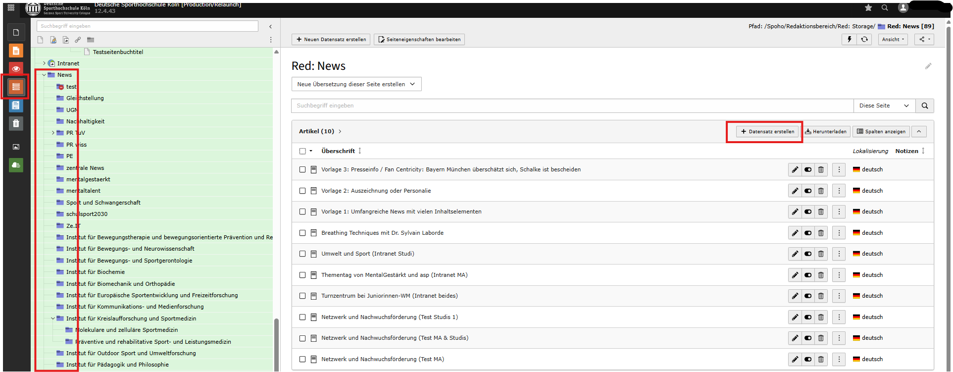 Um einen neuen News-Beitrag anzulegen, öffnen Sie den News-Ordner Ihres Auftritts in der Listenansicht. Anschließend klicken Sie auf den Button "Datensatz erstellen" (siehe Screenshot grüne Umrandung). Daraufhin öffnet sich eine Eingabemaske für eine News und Sie können den Beitrag anlegen. Möchten Sie eine bereits bestehende News bearbeiten, klicken Sie im jeweiligen Datensatz auf das Stift-Symbol. Befinden Sie sich in der Bearbeitungsmaske einer News erscheinen oberhalb diese Buttons, mit denen Sie den Datensatz schließen, speichern, anzeigen oder löschen oder auch einen weiteren neuen Beitrag anlegen können.