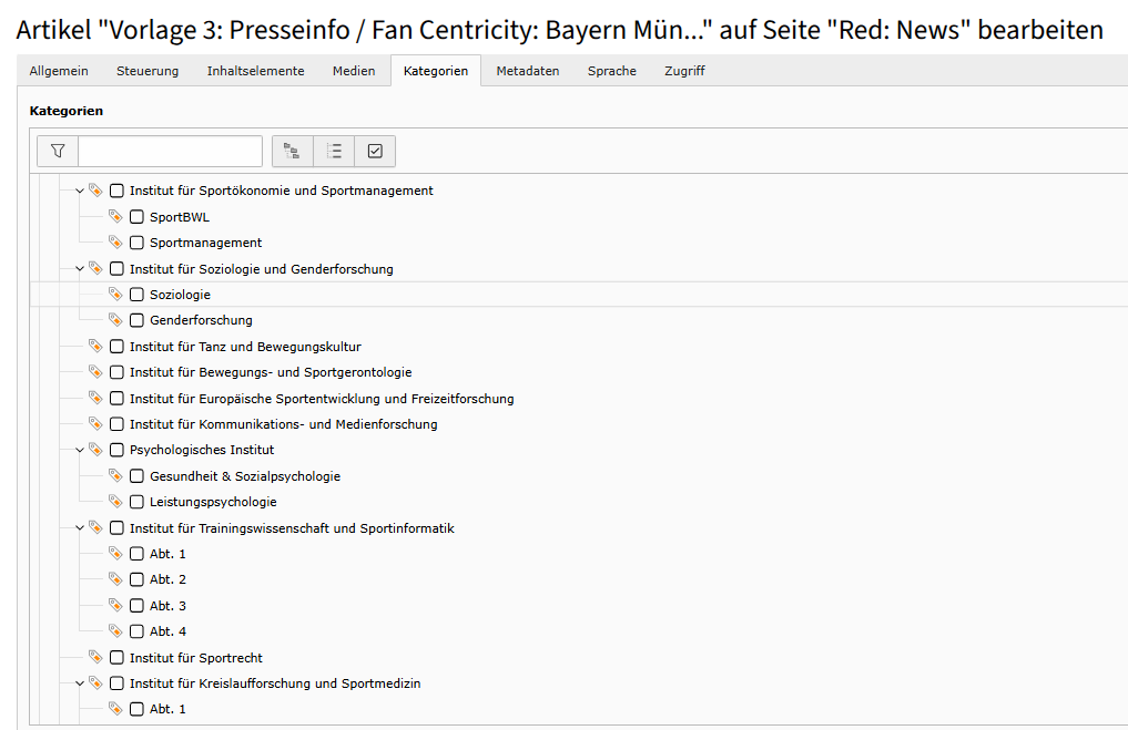 Nur passende und so wenige wie möglich. Kategorien steuern Sichtbarkeit, Filter und zentrale Ausspielung. Zu viele Kategorien machen Inhalte unübersichtlich. Wenn Sie hier unsicher sind, melden Sie sich gerne beim Webteam: web@dshs-koeln.de.