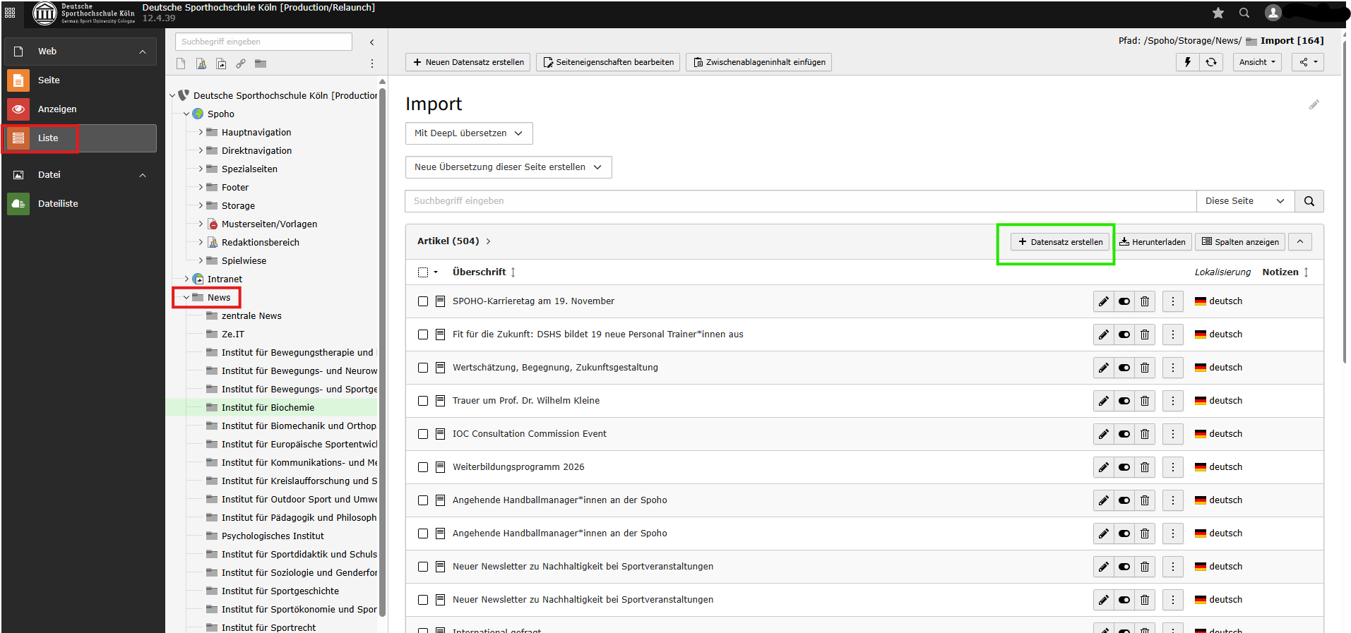 Um einen neuen News-Beitrag anzulegen, öffnen Sie den News-Ordner Ihres Auftritts in der Listenansicht. Anschließend klicken Sie auf den Button "Datensatz erstellen" (siehe Screenshot grüne Umrandung). Daraufhin öffnet sich eine Eingabemaske für eine News und Sie können den Beitrag anlegen. Möchten Sie eine bereits bestehende News bearbeiten, klicken Sie im jeweiligen Datensatz auf das Stift-Symbol. Befinden Sie sich in der Bearbeitungsmaske einer News erscheinen oberhalb diese Buttons, mit denen Sie den Datensatz schließen, speichern, anzeigen oder löschen oder auch einen weiteren neuen Beitrag anlegen können.
