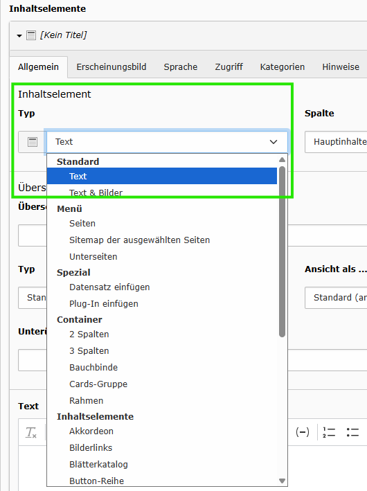 Dieser Reiter bietet Ihnen, ergänzend zum Text aus dem Rich-Text-Editor, die Möglichkeit, den Inhalt des News-Beitrags mit Hilfe von Inhaltselementen zu strukturieren. Hier stehen Ihnen alle Inhaltselemente zur Verfügung, die Sie auch bei der Erstellung von normalen Seiten sehen, doch für die News machen nicht alle Elemente gleichermaßen Sinn. Um ein neues Inhaltselement hinzuzufügen, klicken Sie auf den Button "Neu anlegen" und wählen anschließend im Drop-down-Menü "Typ" des Inhaltselements den gewünschten Typ aus: