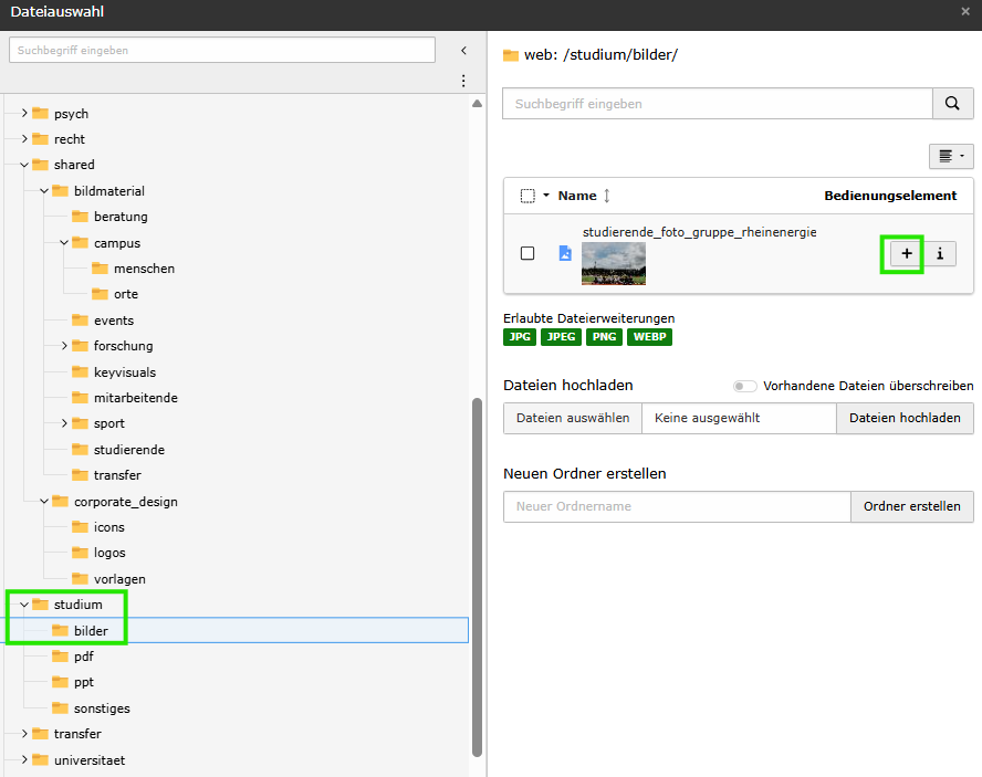 Wenn sich das gewünschte Bild noch nicht im Dateiverzeichnis befindet, laden Sie es zunächst in Ihren Dateiordner hoch.