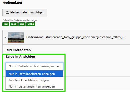 Anschließend wählen Sie über das Drop-down-Menü "Zeige in Ansichten" aus, ob das Bild in der Listen- und Detailansicht oder nur für eine bestimmte Ansicht genutzt werden soll.