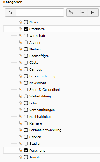 In diesem Reiter können Sie den News-Beitrag einer Kategorie zuweisen. Die Kategorien dienen dazu, auf bestimmten Seiten nur bestimmte News anzeigen zu lassen oder auch eine News auf mehreren Seite ausspielen zu können, z.B. auf einer Institutsseite und gleichzeitig auf der Themenstartseite Forschung. Nicht bei allen Auftritten werden Kategorien genutzt, um die News-Beiträge zu filtern. Das Web-Team kann Ihnen darüber Auskunft geben. Dazu können Sie gewünschte Kategorie im Baum anklicken (Beispiel):Reiter "Metadaten"