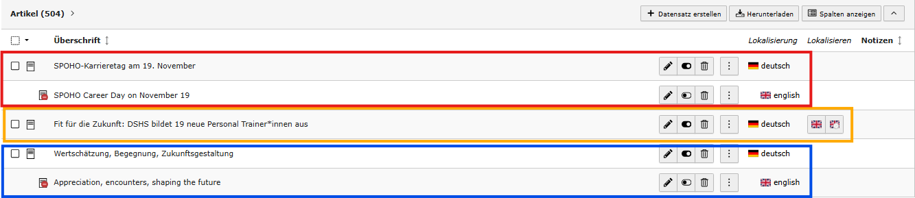 Um eine News zu übersetzen, öffnen Sie den jeweiligen News-Ordner, welcher den Artikel enthält, in der Listenansicht. Zunächst muss der Ordner selbst als englischer Seitentitel angelegt sein. Suchen Sie dann den zu übersetzenden Artikel in der Tabelle "Artikel". In der Spalte "Lokalisieren" sehen Sie an jedem Artikel, welcher noch nicht übersetzt wurde. Im Screenshot ist dies zum Beispiel die News mit dem orangenen Rahmen; die News mit der roten und der blauen Umrandung wurden bereits lokalisiert und erscheinen in der Liste eingerückt. Die rote und blaue Variante unterscheiden sich in der Art der Übersetzung; rot = selbst übersetzt, blau = mit DeepL übersetzt: