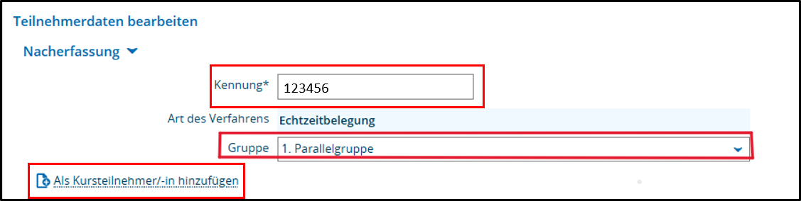 - Nehmen Sie auf der nächsten Seite unter Teilnehmerdaten bearbeiten die Eintragung vor. Zur Nacherfassung geben Sie unter Kennung die Matrikelnummer des Studierenden ein, wählen Sie bei mehreren Parallelgruppen die richtige Gruppe aus und drücken anschließend auf Als Kursteilnehmer:in hinzufügen.