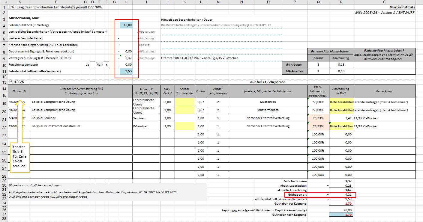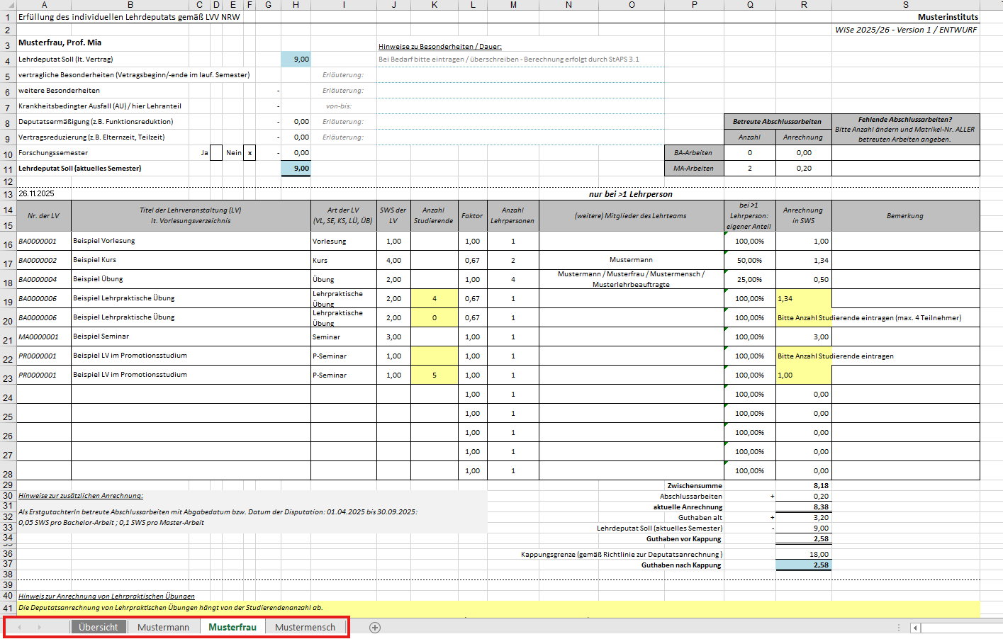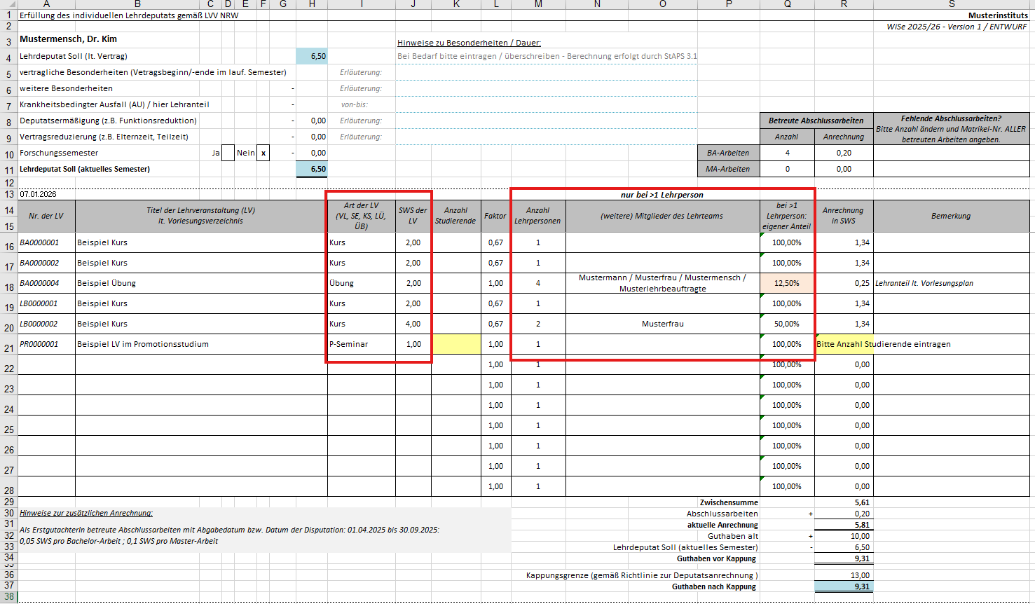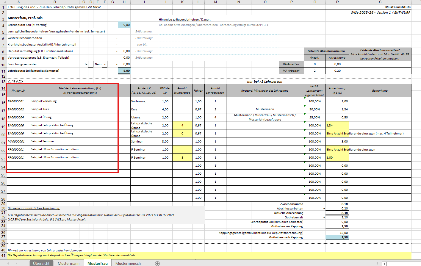 WICHTIG: Bitte verändern Sie NICHT die SWS der LV (Spalte J) zur Berechnung der anteiligen, anzurechnenden SWS!