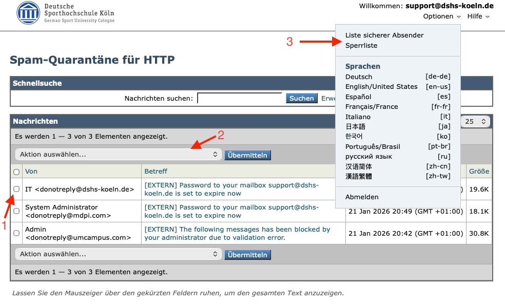 Um die Nachrichten in der Spamquarantäne einzusehen gehen Sie in Ihrem Browser zu