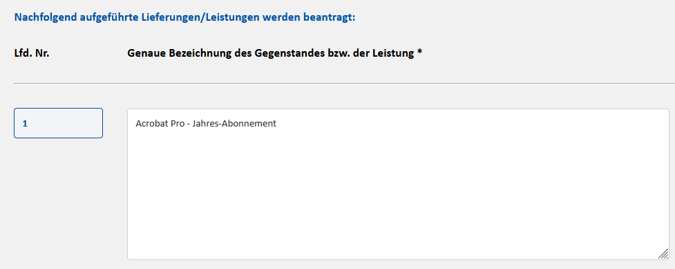 Bitte im Feld "Genaue Bezeichnung des Gegenstandes bzw. der Leistung *" folgendes eintragen und den Beschaffungsantrag anschließend entsprechend vervollständigen und weiterleiten.