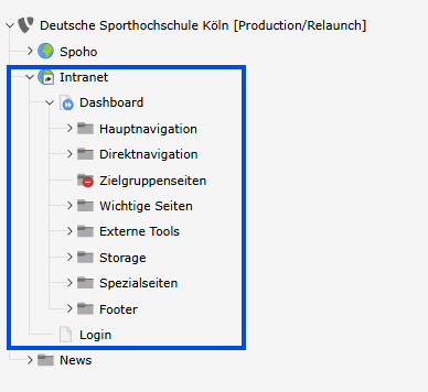 Wenn Sie an Seiten und Bereichen im Intranet arbeiten und die entsprechenden Berechtigungen vergeben sind, finden Sie die Intranetseiten nach dem Login in TYPO3 unterhalb des Globus-Icons "Intranet":