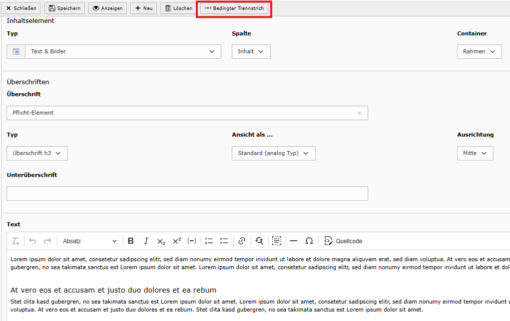 Sobald Sie ein Inhaltselement geöffnet haben, finden Sie die Funktion "bedingter Trennstrich". Um diesen zu setzen, navigieren Sie mit dem Cursor in dem Wort an die gewünschte Trennstelle und klicken dann auf "bedingter Trennstrich".
