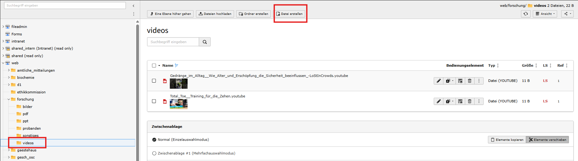 Sie haben die Möglichkeit, Videos über eine YouTube-URL in die Webseite einzubinden. Ein Hochladen der Videodatei direkt ins TYPO3-System ist dazu nicht notwendig und nicht vorgesehen. Wenn Sie ein Video einbinden möchten, muss dieses zunächst auf YouTube verfügbar sein; hier reicht auch eine ungelistete Präsenz des Videos, lediglich die URL des Videos muss für Sie zur Verfügung stehen. Die Verknüpfung der Videodatei legen Sie am besten in einem Unterordner Ihres Dateiordners an. Klicken Sie dort auf den Button "Datei erstellen":