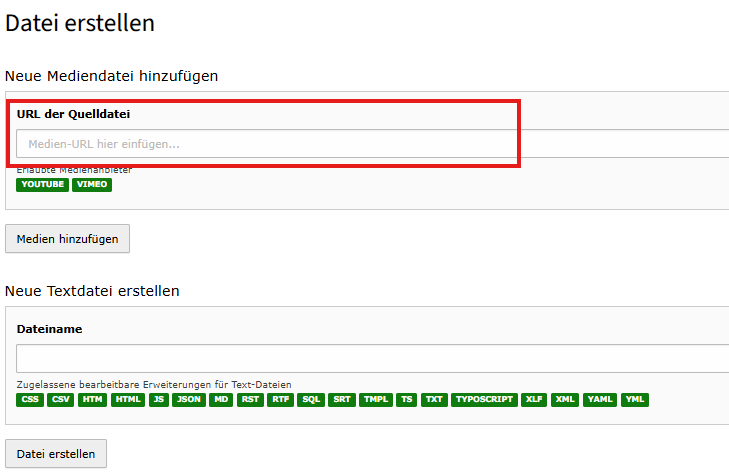 Tragen bzw. kopieren Sie dann in der Zeile "Neue Mediendatei hinzufügen" > "URL der Quelldatei" die URL Ihres Videos ein und klicken Sie auf "Medien hinzufügen":
