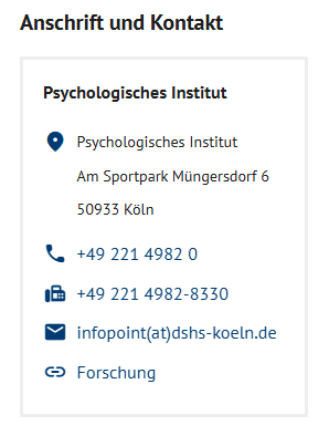 Gut zu wissen: Für alle Serviceeinrichtungen legt das Web-Team Einrichtungs-Cards an, die dann als Referenzen/Klone auf verschiedenen Webseiten eingefügt werden können. Das hat einen wichtigen Vorteil: Ändert sich eine Angabe und wird diese in der Original-Card geändert, ändern sich alle Verknüpfungen der Card automatisch mit. Wenden Sie sich bei Fragen hier zu gerne an web@dshs-koeln.de.