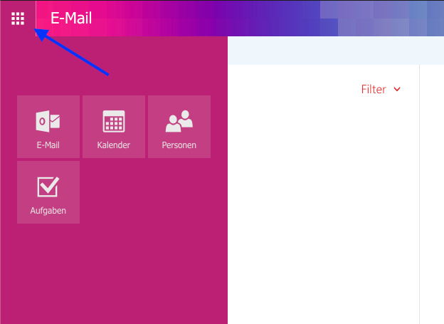 5. Über den Button oben links kann auf weitere Funktionen zugegriffen werden (E-Mail, Kalender, usw.)