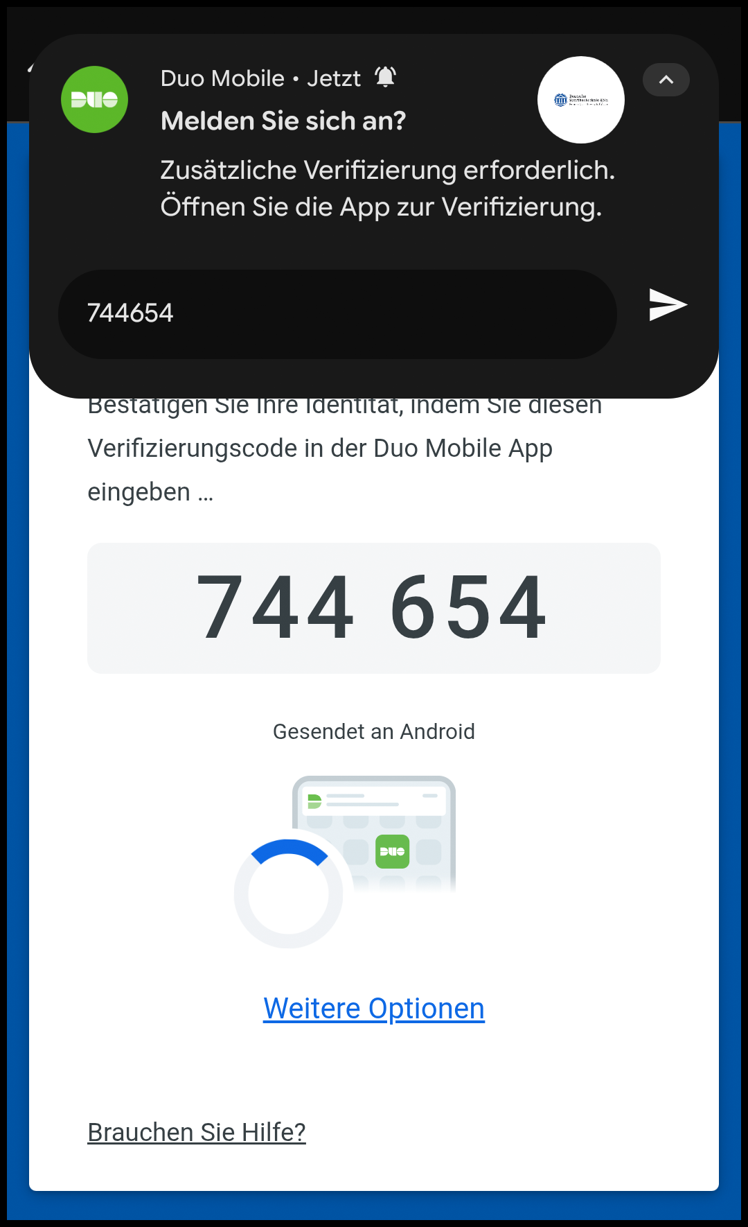 - Nun werden Sie dazu aufgefordert in der DUO Mobile App* für Android, den angezeigten Verifizierungscode zu bestätigen.